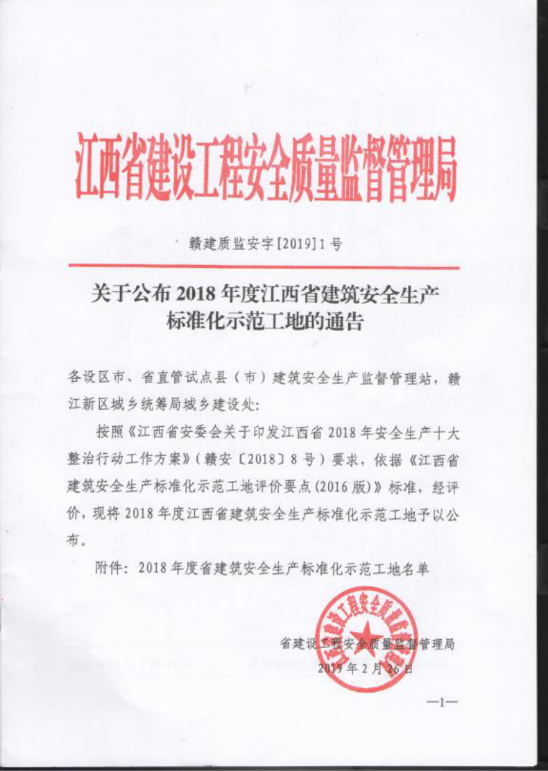 2018年全年安全創(chuàng)優(yōu)工作取得了顯著成績,江西省建筑工程安全質(zhì)量監(jiān)督管理局發(fā)布公告,我司承建的南水.中央公園(一期)項(xiàng)目被評為“2018年度江西省建筑安全生產(chǎn)標(biāo)準(zhǔn)化示范工地“。