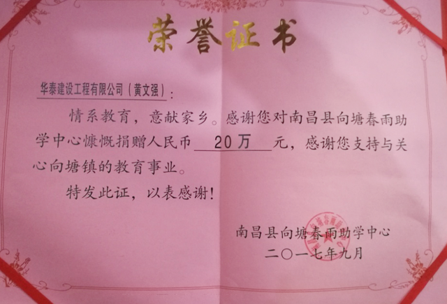 今天我們公司周總代表華泰建設(shè)及公司董事長(zhǎng)黃總參加向塘春雨助學(xué)活動(dòng)并捐獻(xiàn)愛(ài)心。公司在董事長(zhǎng)倡議及帶領(lǐng)下,大力弘揚(yáng)樂(lè)善好施的文明行為,積極營(yíng)造人人關(guān)心、人人參與愛(ài)心助學(xué)行為的良好氛圍,先后參與春雨助學(xué)、苗苗助學(xué)等愛(ài)心活動(dòng)。