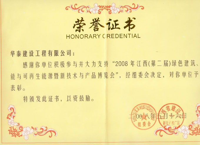 首頁 > 關(guān)于華泰 > 企業(yè)榮譽(yù) > 榮獲2008年綠色建筑博覽會(huì)榮譽(yù)證書