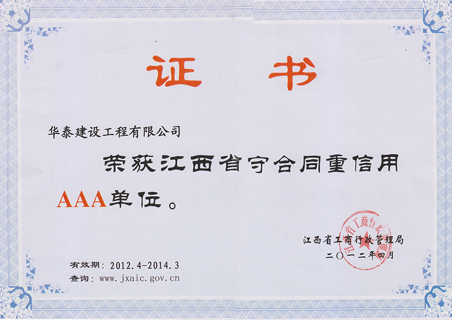 榮獲2012年江西省守合同重信用AAA單位